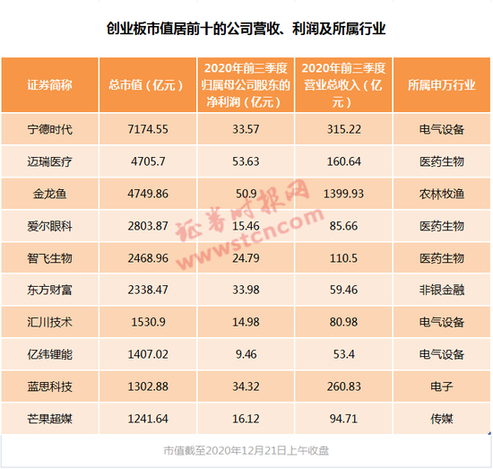 不过,从营收和利润规模来看,宁德时代2020年前三季度营业总收入315.22亿元,少于金龙鱼、温氏股份、上海钢联,位居创业板第四位,公司2020年前三季度归属母公司股东的净利润33.57亿元,在温氏股份、迈瑞医疗、金龙鱼、英科医疗、昆仑万维、蓝思科技和东方财富之后,位居创业板第8位。