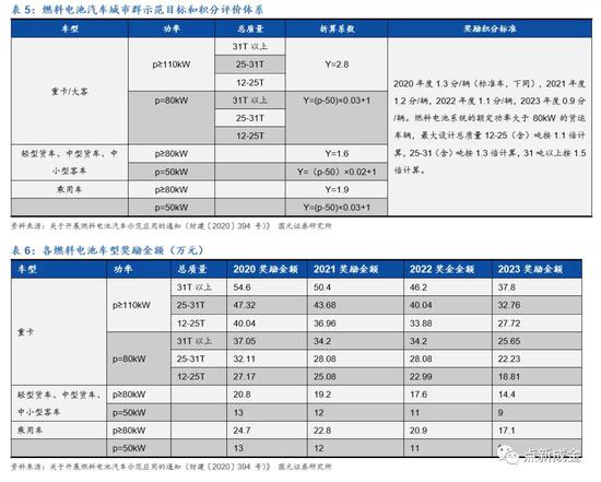 奖补政策鼓励车型朝大功率与重载方向发展。根据燃料电池汽车城市群示范目标和积分评价体系,对于货车和客车来说,功率和载重越大,对应的国家奖励金额则越多。以2020年积分标准测算,50kW车型,奖励13万/辆,80kW&12吨车型奖励22.9万/辆,110kW&25吨+车型奖励47.3万/辆,110kW&31吨+车型奖励54.6万;假设地补1:1的话,则50kW总补贴26万;80kW&12吨总补贴45.8万;110kW&25吨+总补贴车94.6万;110kW&31吨+总补贴车109.2万。一方面燃料电池适用于重载领域,另一方面奖补政策的鼓励进一步刺激产业链企业向燃料电池重卡方向发展,我们预计未来燃料电池主要应用车型将是重卡。