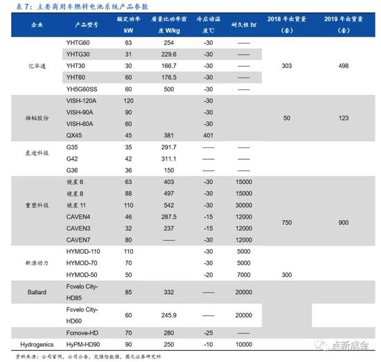 技术水平持续提升,国际化竞争力开始显现。中国燃料电池系统在功率密度、冷启动温度方面不逊色于国外一流企业,亿华通YHTG60SS、重塑科技镜星11系统功率密度达到500W/kg,超越Ballard和Hydrogenics产品;在寿命方面也与国外产品差距不大,重塑科技CAVEN系列产品达到1.2万小时,超越Hydrogenics产品寿命。中国燃料电池系统产品竞争力强劲,开始拓展海外市场, 2019年第46届东京车展上,三菱扶桑卡车和公共汽车公司(Mitsubishi Fuso Truck and Bus Corporation)展示其首款氢燃料电池轻型卡车FUSO Vision F-Cell,车辆系统由中国燃料电池系统龙头重塑科技提供。日本为全球燃料电池技术的领头羊,三菱扶桑选择重塑科技作为系统供应方,充分说明了商用车燃料电池系统领域里,国产龙头的技术已经可以媲美国际领先水平。