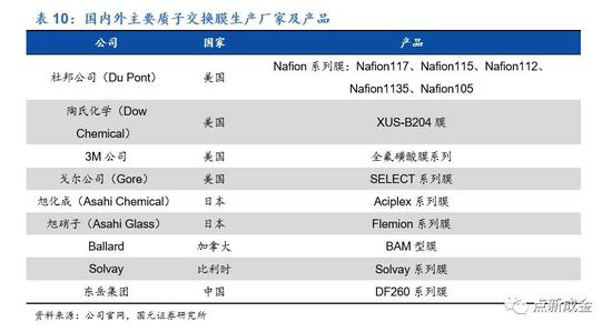质子交换膜国产企业有在持续研发,国内东岳集团可量产DF260系列膜,但是目前主要依赖进口。目前市场上主要生产全氟磺酸膜的企业主要来自于美国、日本、加拿大以及中国,其中戈尔的Select复合膜广泛应用于燃料电池,丰田Mirai、本田Clarity和现代ix35均采用戈尔Select系列膜。除此以外,质子交换膜还有杜邦的Nafion系列膜、陶氏化学(Dow Chemical)的Xus-B204 膜、3M的全氟磺酸膜、日本旭化成的Alciplex系列膜、旭硝子的Flemion系列膜、加拿大Ballard的BAM膜和比利时Solvay的系列膜。