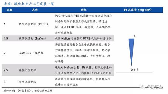 当前MEA生产工艺主要是CCM法,制备方法由喷涂走向涂布。膜电极技术经历了三代发展,大体上可以分为热压法、CCM(catalyst coating membrane)法和有序化膜电极三种类型。目前大部分厂商选择第二代CCM三合一膜电极技术,2019年以前国内绝大部分企业采用喷涂法制备CCM,2019年开始,领先企业转换用涂布法制备CCM。有序化膜电极是当下工艺发展趋势。有序化膜电极能兼顾超薄电极和结构控制,拥有巨大的单位体积的反应活性面积及孔隙结构相互贯通的新奇特性,可以达到高效三相传输、高Pt利用率、高耐久性,使其成为了PEMFC领域的研究热点,也是下一代膜电极制备技术的主攻方向。