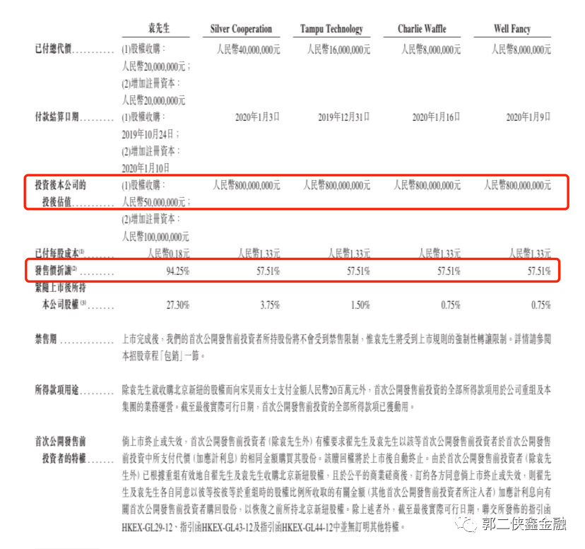 IPO前,公司最后一轮融资是今年1月份,投后估值8亿人民币(约9.47亿港元),以本次发售中间价计市值29.48亿港元,一年时间估值暴涨311%,这速度也太快了。除上市后占股27.3%的袁先生外,其它上市前投资者没有禁售期。