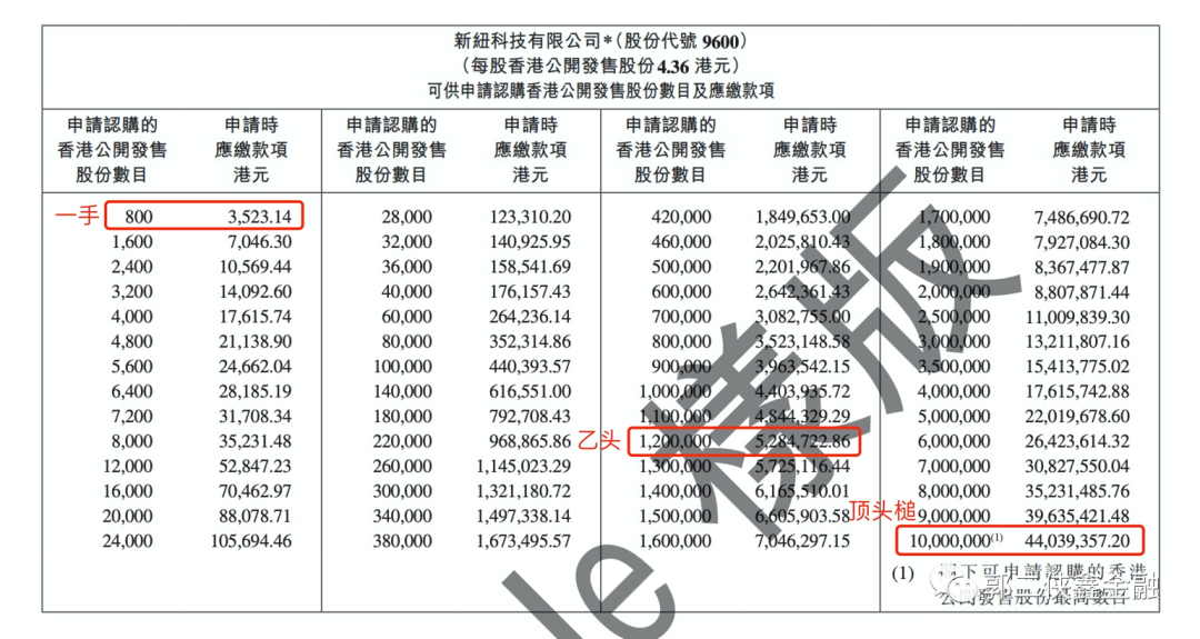 香港公开发售2000万股,每手800股,合计25000手,在不启动回拨的情况下,甲乙组各获配12500手。