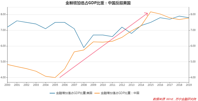 金融业赚钱人尽皆知。但在大家的朴素认知中,中国金融业相较美国还是应该有很大差距的,毕竟人家是国际金融中心,美元是国际货币,金融机构可以辐射全球。可从数据上看,中国金融业增加值在GDP中的比重已经比肩美国。当然,背后有一些结构性因素,但这一事实本身已足以论证“金融让利实体”的必要性。