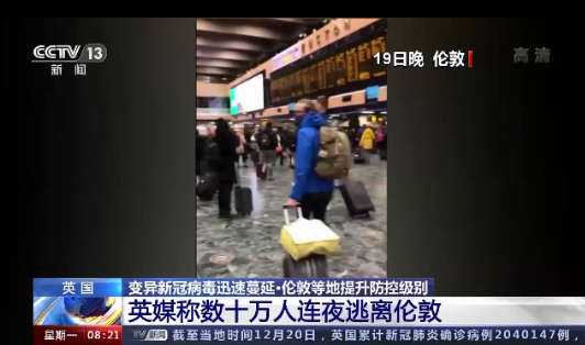 当日,英政府宣布收紧圣诞期间防疫限制措施,把首都伦敦和英格兰东南部地区的疫情防控级别提升至新增的第四级。据英国媒体报道,当地时间19日晚,英国政府宣布伦敦等地的防疫措施将升级后,二、三十万人通过铁路、公路等方式,赶在禁令生效前“火速逃离”伦敦。