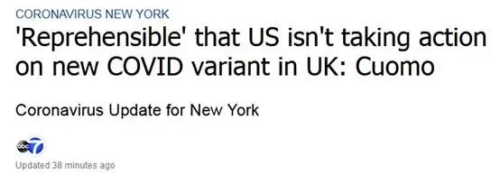 新冠病毒在英国出现新变种,大洋彼岸的纽约州长也开始担心了。据美国广播公司(ABC)报道,当地时间20日,纽约州州长科莫批评说,既然有一种新的变种病毒在英国传播,为什么每天仍有航班从英国飞抵纽约机场且没有要求乘客提供核酸检测证明,“我们什么也没做”。