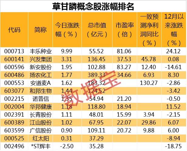 证券时报·数据宝统计显示,A股上市公司中布局草甘膦生产的有13家。今日农林牧渔行业涨势居前,草甘膦概念股也多线飘红。其中丰乐种业涨停,龙头兴发集团上涨3.3%。丰乐种业主要产品包括草甘膦制剂,公司以农化产品和育种双主业进行发展。