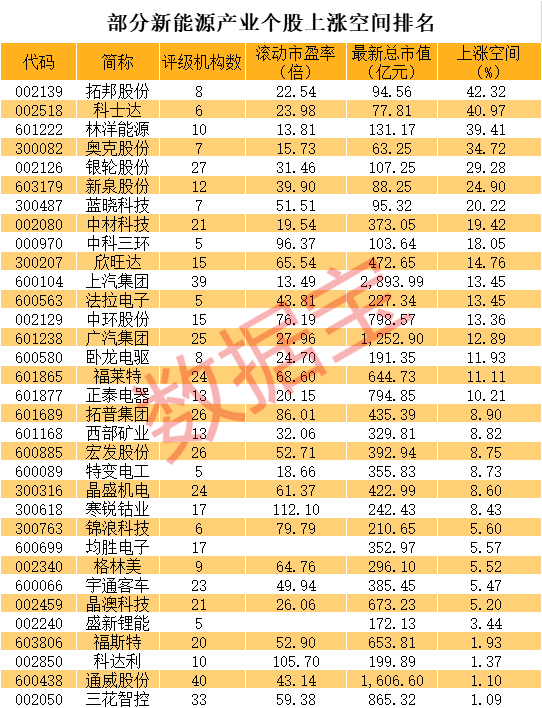 证券时报·统计显示,部分新能源产业概念板块中,评级机构5家以上的个股,合计有33只个股最新价低于机构一致目标价。上涨空间来看,拓邦股份、科士达、林洋能源、奥克股份等个股上涨空间超过30%。