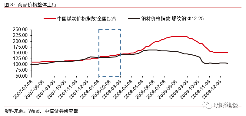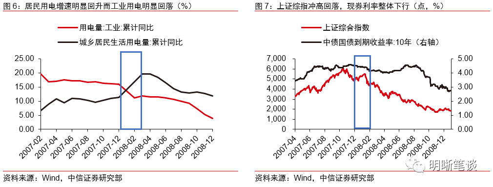 2008年1-2月,中国南方地区发生大范围低温、雨雪、冰冻等自然灾害,部分南方城市受损严重,电力设施、交通运输遭受重创,同时,温度骤降推升居民用电需求,2008年1-2月城乡居民用电量同比增长16.93%,较2007年全年的11.37%上行5.56pcts,用电负荷快速增长导致煤炭库存快速回落,全国电煤库存降至历史低位,多个省级电网采取限电的方式以缓解电力缺口。在此环境之下,工业用电骤减,2008年一季度工业用电量同比增长11.79%,较2007年全年的15.99%下行4.2pcts,同时工业增加值同比增速也明显回落,2008年1-2月工业增加值同比增长15.4%,为2008年内低点。在此期间,A股市场冲高回落,截至2008年2月底,上证综指收在4348点,较2007年底的5261点明显回落;债券市场有所走强,10年期国债收益率从2007年底的4.43%下行至2008年2月末的4.13%;商品方面,煤炭价格明显上涨,铁矿石、螺纹钢、有色金属等商品价格也有明显走强。