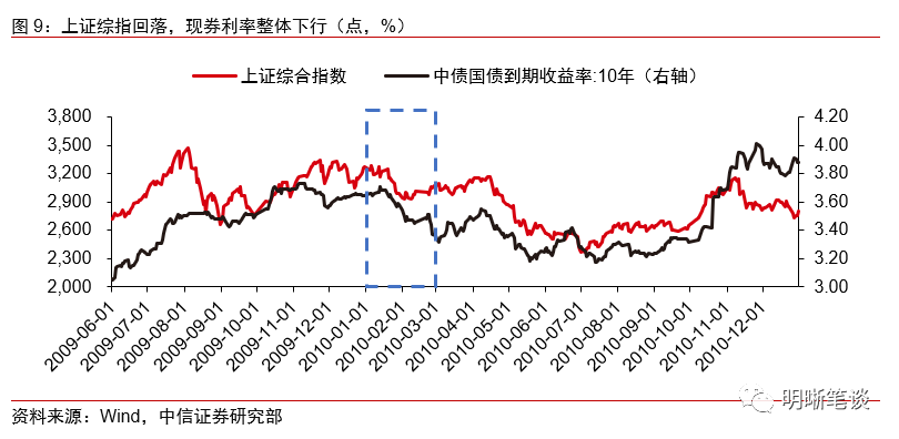2010年1-2月,寒潮再次席卷我国内地,受此影响,我国居民用电需求再次攀升,电煤库存明显回落,电煤供应矛盾愈发明显,部分地区采取限电的方式缓解电力供需矛盾。在此阶段,煤炭价格明显上涨,铁矿石、螺纹钢价格整体上行,而铜、铝等有色金属价格则整体呈震荡态势。股市方面,A股市场整体呈回落态势,从2009年底的3277下降至2010年2月的3051。债市方面,中债10年期国债收益率则从3.66%回落至3.37%。经济数据方面,工业增加值同比增速在基数效应的影响下明显回升,但PMI生产、新订单指数则整体呈回落态势。