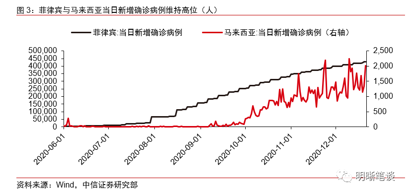 从需求端的角度看,用电旺季来临、出口订单走强也可能推升社会用电需求,进而导致电力供应相对偏紧。一方面,今年全国入冬偏早,国内气温整体偏低,这在一定程度上推升了居民的用电需求;另一方面,由于疫情影响,全球工业体系受到明显冲击,部分新兴市场国家受损较重,如越南、菲律宾、马来西亚等国的新增病例人数仍维持在相对高位,这对此类国家的国内产业链与外贸形势产生了明显影响,同时由于我国的出口结构与上述国家具有一定的相似之处,我国的出口迎来了“替代性”增长,对于浙江义乌等出口导向型地区而言,出口订单的高增也可能推升此类地区的用电需求并加大电力供需矛盾。