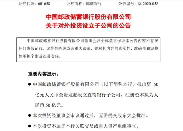 12月21日,邮储银行公告称,拟全资发起设立直销银行子公司,名称拟为中邮邮惠万家银行有限责任公司(下称“邮惠万家银行”),注册资本拟为50亿元人民币,注册地拟为上海市,邮储银行持股比例为100%。