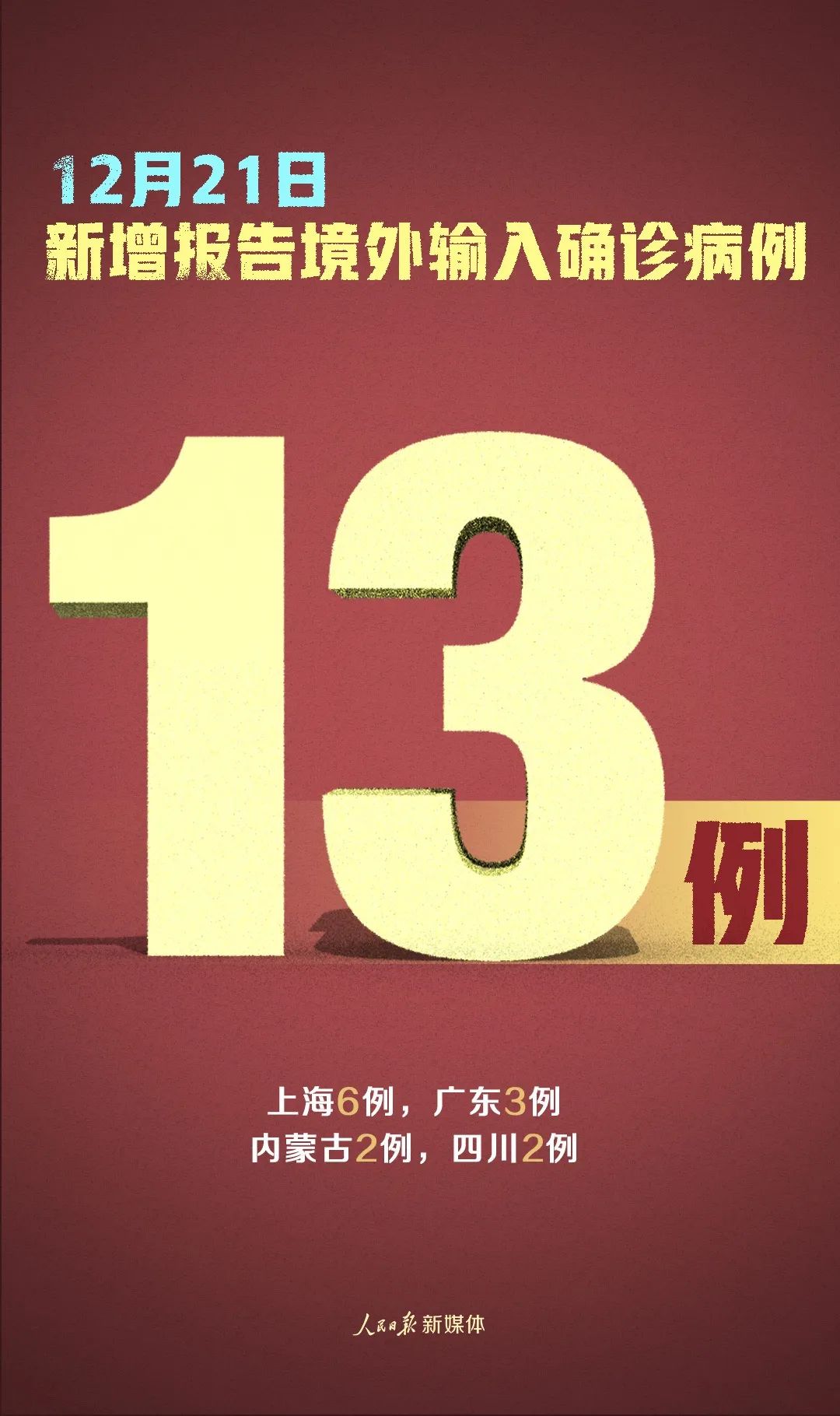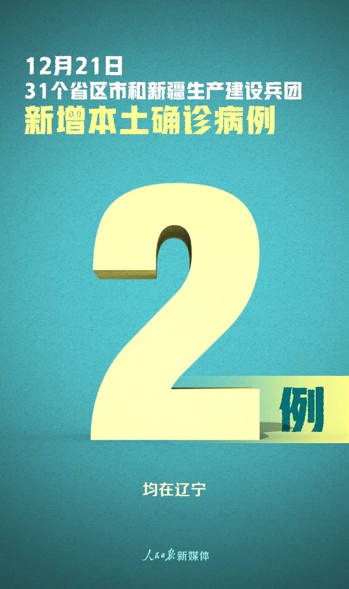 12月21日0—24时,31个省(自治区、直辖市)和新疆生产建设兵团报告新增确诊病例15例,其中境外输入病例13例(上海6例,广东3例,内蒙古2例,四川2例),本土病例2例(均在辽宁);无新增死亡病例;无新增疑似病例。