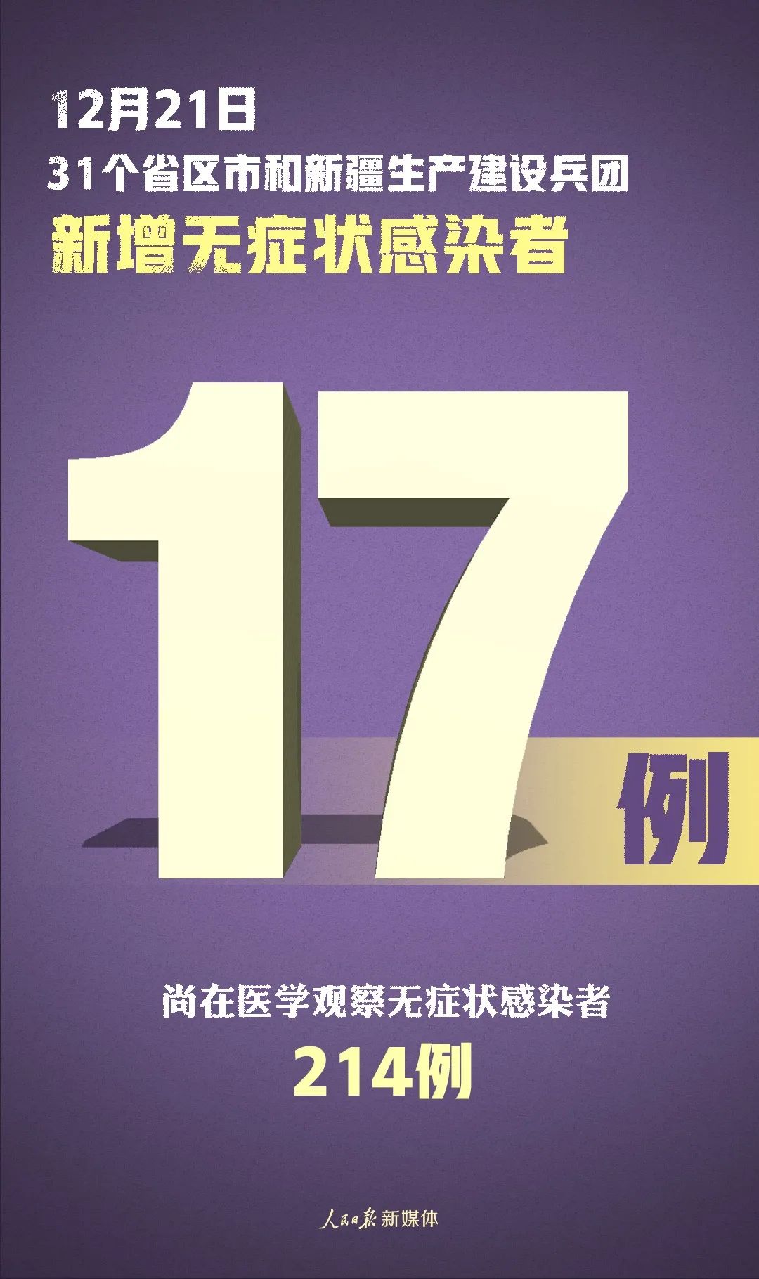 31个省(自治区、直辖市)和新疆生产建设兵团报告新增无症状感染者17例(境外输入11例);当日转为确诊病例2例(均为境外输入);当日解除医学观察9例(均为境外输入);尚在医学观察无症状感染者214例(境外输入182例)。