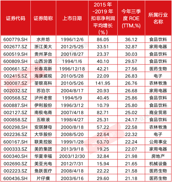 而依据上述三个指标筛选(2015年之前上市、2015年-2019年扣非净利润均同比正增长、ROE大于等于10%),除了上述14家公司外,共有106家公司入选,其中,水井坊、浙江美大和贵州茅台等ROE居前(见表3)。以此来看,在北上资金未来扩容的情况下,这些个股或成重点增持的“优选项”。