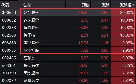 口罩股中,延江股份、泰达股份、道恩股份等6只个股涨停,整个板块涨超3.6%。