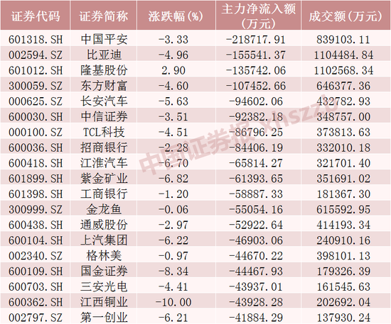从个股情况来看,Wind数据显示,今日中国平安、比亚迪、隆基股份、东方财富主力资金净流出金额居前,分别净流出21.87亿元、15.55亿元、13.57亿元、10.75亿元。此外长安汽车、中信证券、TCL科技、招商银行、江淮汽车、紫金矿业、工商银行、金龙鱼、通威股份等9只个股主力资金净流出超5亿元。可以看到,流动性好的热门股遭遇主力资金流出。