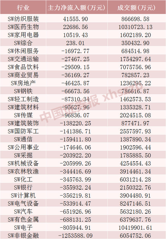 从行业板块情况来看,今日仅有纺织服装、医药生物、家用电器、综合行业出现主力资金净流入,分别净流入4.16亿元、2.27亿元、1.05亿元、0.02亿元;非银金融、电子、有色金属行业主力资金净流出金额居前,分别净流出125.36亿元、80.59亿元、68.81亿元。
