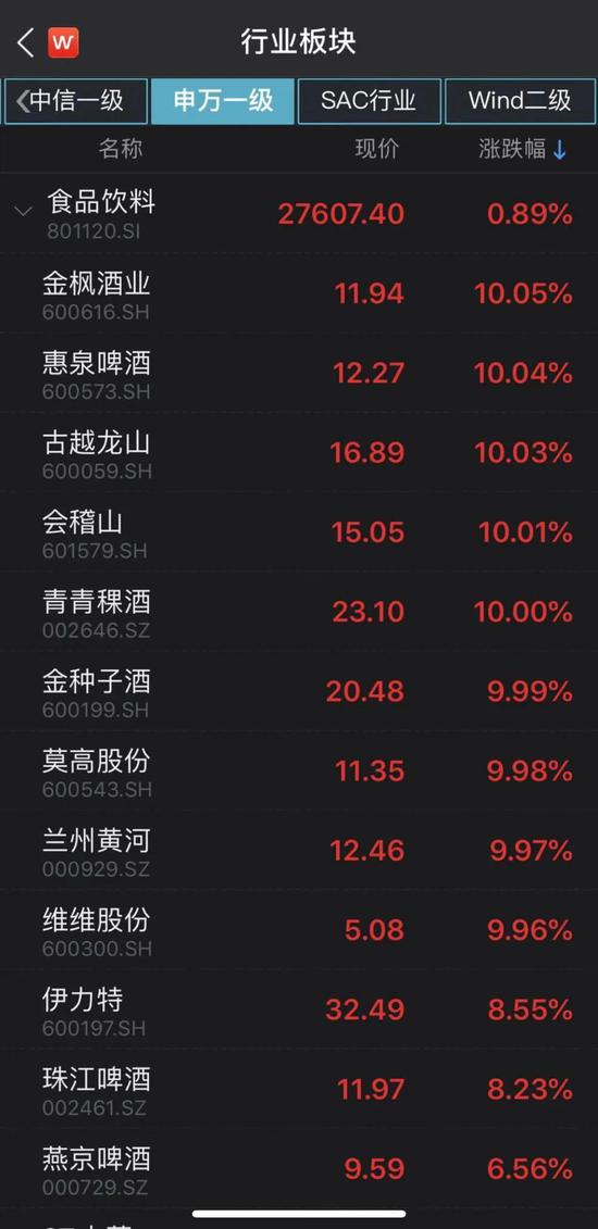 而食品饮料板块中有50 只个股上涨,板块内金枫酒业、惠泉啤酒、古越龙山、会稽山、金种子酒等多股涨停,涨幅居前的多为酒类股。此外,贵州茅台、五粮液分别上涨2.09%、0.17%,均在今日盘中创下历史新高。