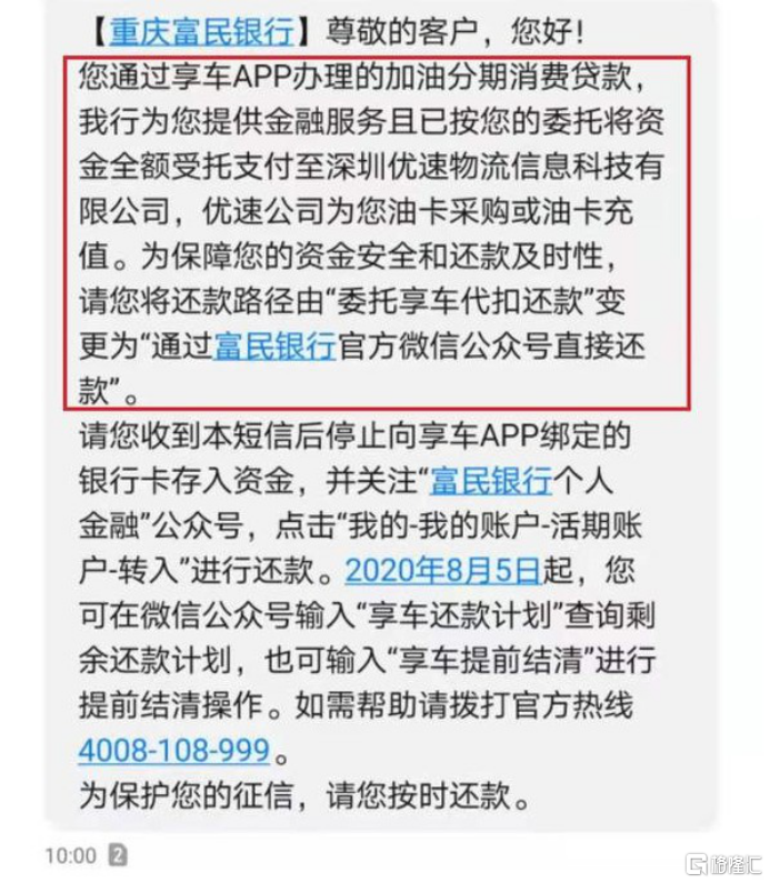 上周享车APP的爆雷就是个典型的例子,富民银行也因此陷入借贷旋涡。用户在平台领到的9折加油卡变成了消费贷款,莫名收到催款短信才得知真相。目前享车APP已经不能正常使用,而其涉及的用户遍布全国,预估20多万人,有的最高背负贷款上百万。