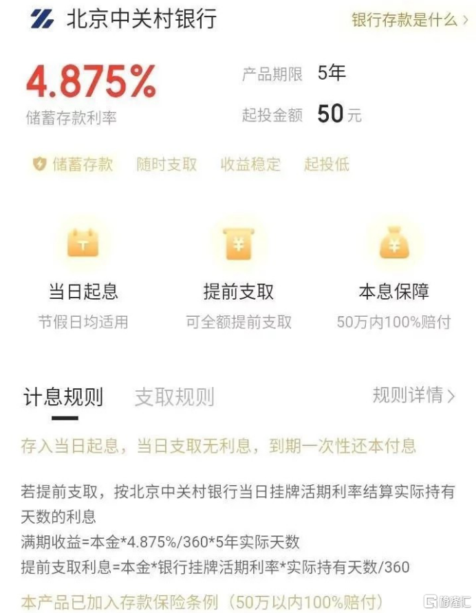 比如富民银行与享车平台合作的5年期存款产品,年利率为4.8%;北京中关村银行在互联网平台发布的5年期存款利率亦高达4.875%。