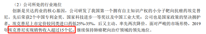 埃克替尼是一种小分子靶向抗癌药,是贝达药业的核心产品。2019年年报显示,埃克替尼几乎贡献了公司全部的收入。2019年,公司实现营业收入15.54亿元,其中15亿元以上收入由埃克替尼贡献。