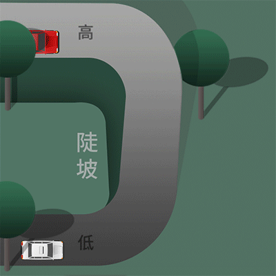 在狭窄的坡路,上坡的一方先行;但下坡的一方已行至中途而上坡的一方未上坡时,下坡的一方先行。