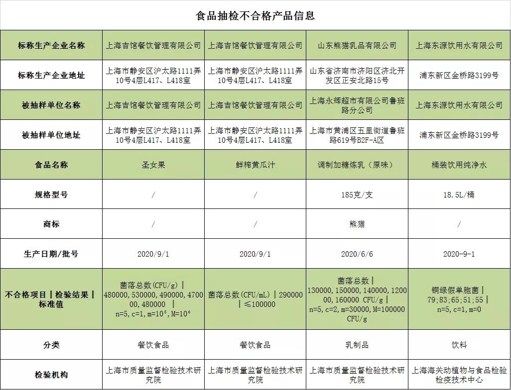 其中,不合格样品为:上海吉馆餐饮管理有限公司制作销售的圣女果(不合格项目:菌落总数)。上海吉馆餐饮管理有限公司制作销售的鲜榨黄瓜汁(不合格项目:菌落总数)。山东熊猫乳品有限公司生产、上海永辉超市有限公司鲁班路分公司销售的调制加糖炼乳(原味)(不合格项目:菌落总数)。上海东源饮用水有限公司生产销售的桶装饮用纯净水(不合格项目:铜绿假单胞菌)。