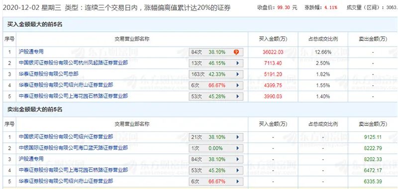 而在12月2日最新公布的,连续3个交易日榜单中,银河证券绍兴营业部获利了结,现身卖一席位,合计卖出9125.11万元。华泰证券公司总部、银河证券凤起路等营业部则大幅买入。