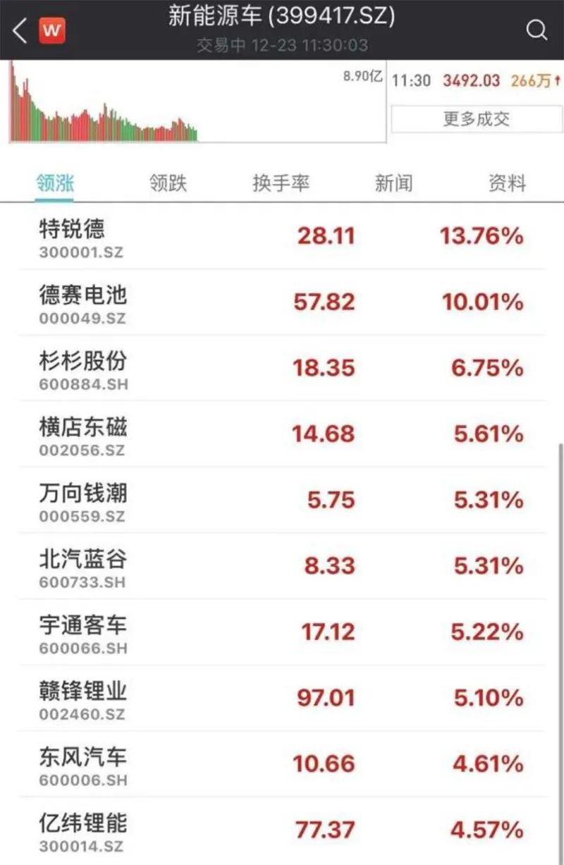 新能源车概念也全线走强,特锐德涨超10%,德赛电池涨停,杉杉股份、横店东磁等跟涨。