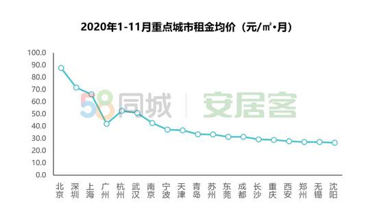 尽管在新冠肺炎疫情影响下,全国租房市场出现了整体的萎缩,但整体来看,重点城市的租金仍然保持平稳。2020年1-11月,全国重点19城的平均租金在41.2元/平方米/月,与去年相比波动不大。