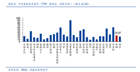 今年涨幅较好的个股主要集中在在线阅读、营销及游戏板块,主要受益于字节跳动。估值层面来看,目前传媒行业PE为25x,处于历史估值底部区域。PE水平在全行业中处于中等水平。