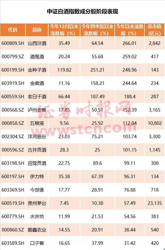 具体到个股来看,上述指数成分股年内无一下跌,超过半数成分股年内股价翻倍,其中山西汾酒、酒鬼酒、金种子酒、金徽酒等股票年内股价甚至涨了2倍以上。