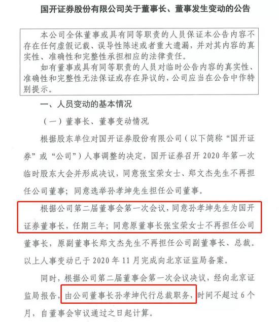 资料显示,孙孝坤出生于1968年,2017年5月至2019年4月曾任国开证券党委副书记,2017年8月起任监事长。2019年4月至2020年8月,孙孝坤担任国家开发银行党委巡视工作小组办公室主任;2020年8月至今,孙孝坤担任国开证券党委书记,其中自10月起任国开证券董事长。