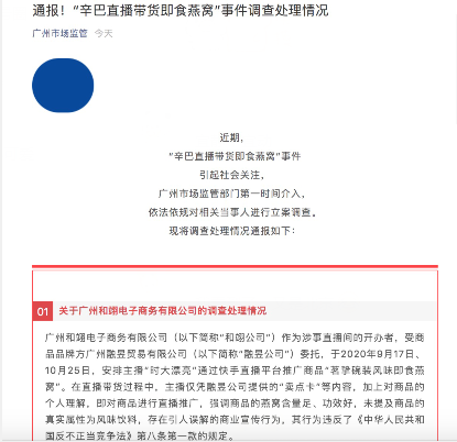 随后,辛巴团队被立案调查。广州市场监管部门今日正式公布“辛巴直播带货即食燕窝”事件调查结果,对辛巴所属和翊公司处90万元行政罚款,对燕窝提供方融昱公司处200万元行政罚款,并责令双方停止违法行为。