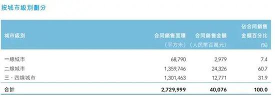 按照城市级别划分,合同销售额里一线、二线及三四线城市的占比分别是7.4%、60.7%和31.9%。