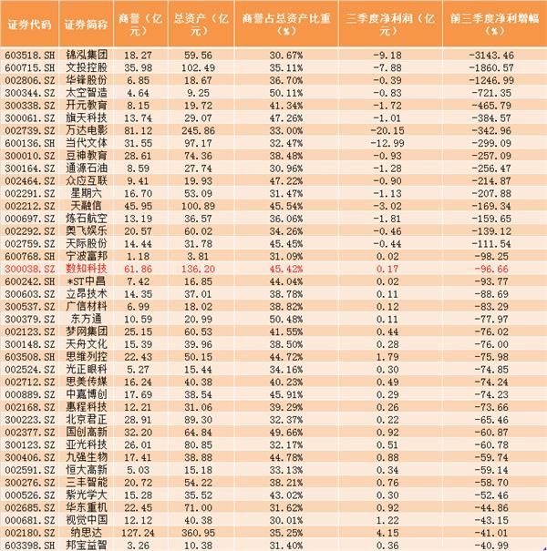 但综合公司前三季度净利来看,锦泓集团、文投控股、华锋股份、太空智造、开元教育、旗天科技、万达电影、当代文体等不仅商誉占比高(超过30%),且前三季度净利出现较大幅度下滑。