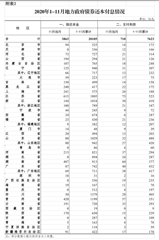 2020年1-11月,地方政府债券支付利息7623亿元。其中,11月当月地方政府债券支付利息710亿元。
