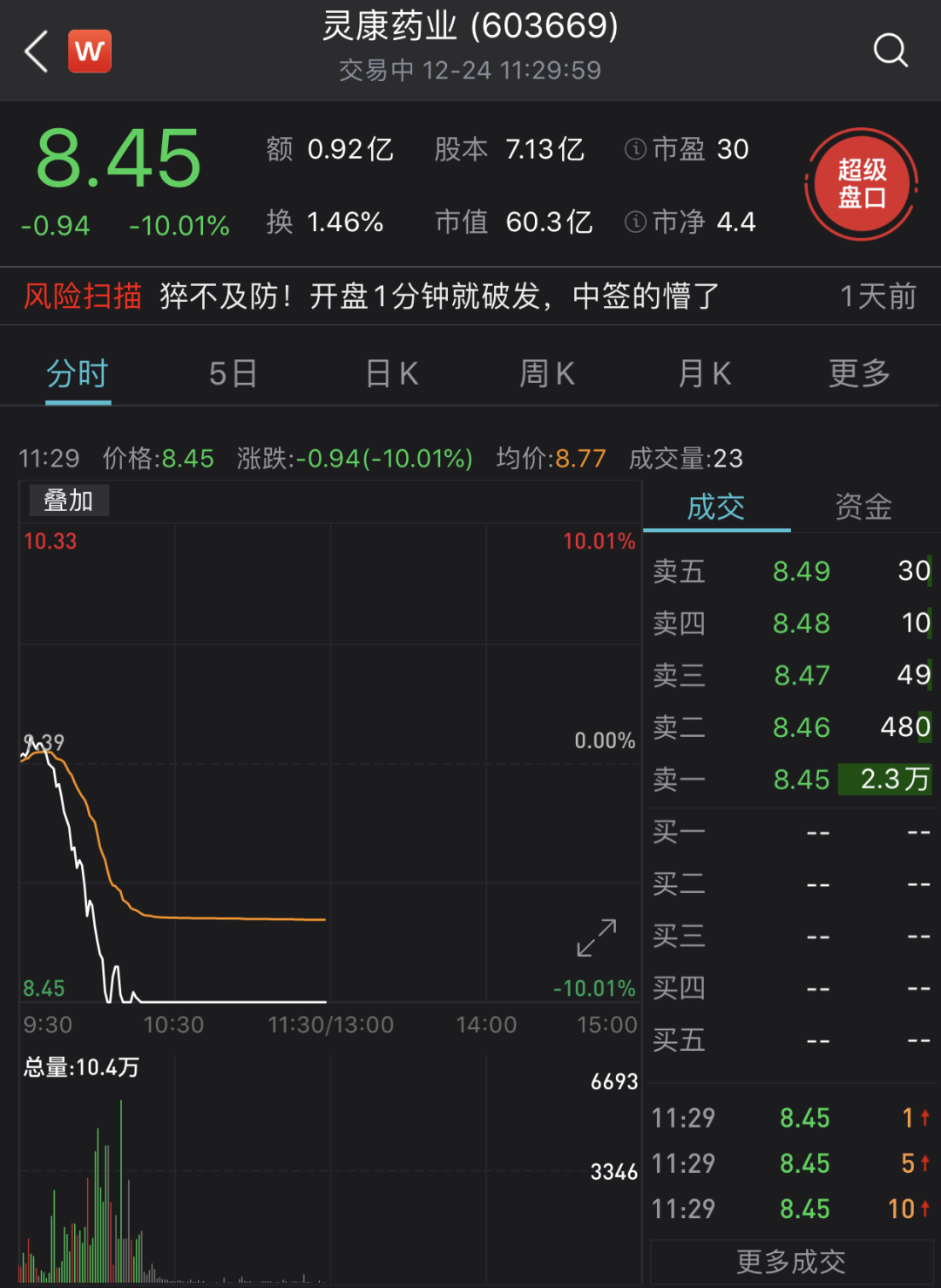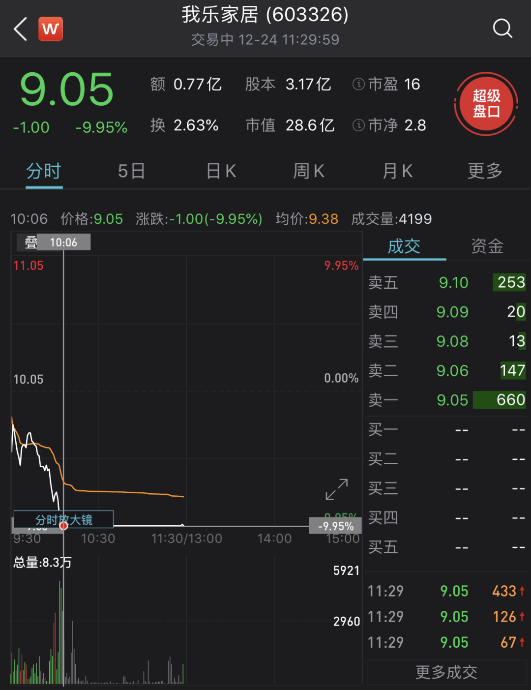 上午10点之后,灵康药业闪崩跌停,成交金额不足1亿元。我乐家居同样闪崩并封死跌停板。