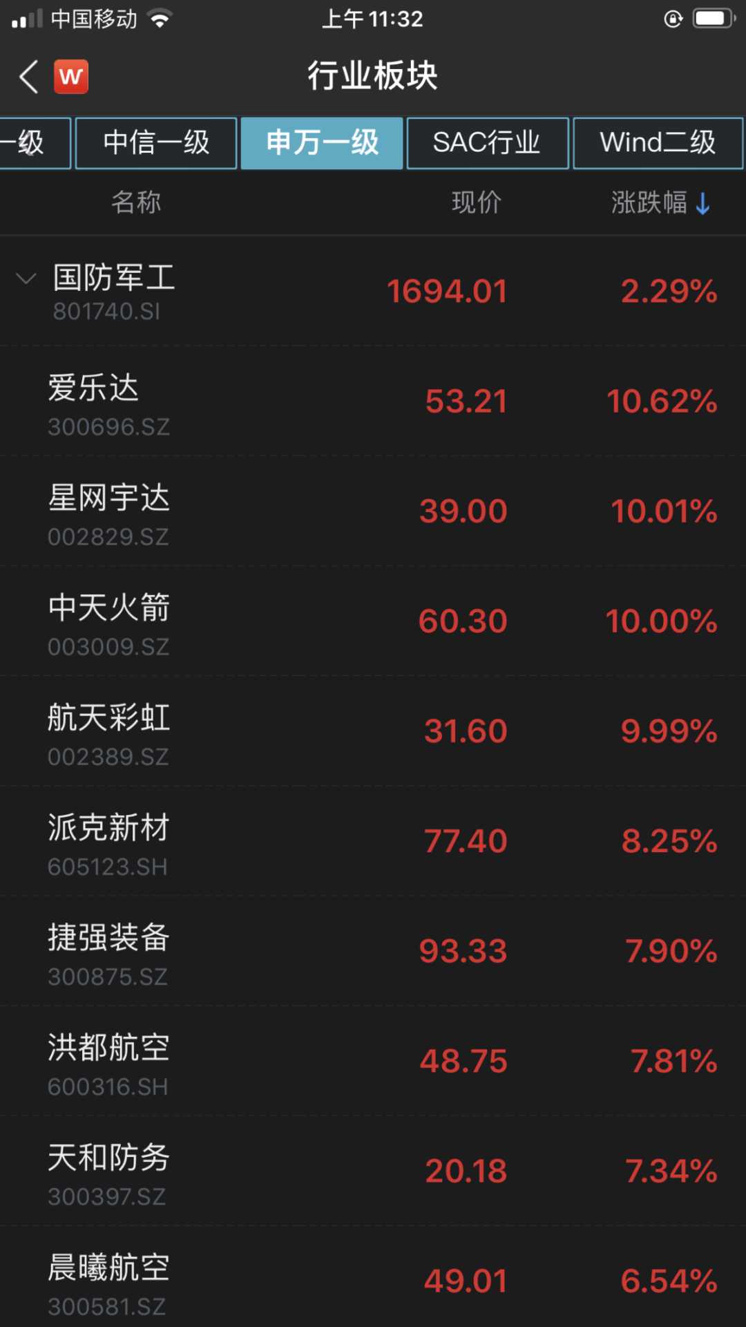 国防军工指数成分股中,爱乐达涨10.62%;星网宇达、中天火箭、航天彩虹涨停;捷强装备涨7.90%;派克新材涨8.25%。
