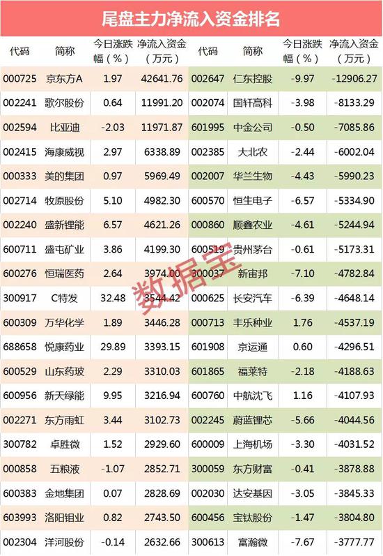 尾盘3股资金流入超亿元,京东方A、歌尔股份两只苹果产业链股流入居首,分别流入4.26亿元和1.2亿元。比亚迪尾盘资金回流1.19亿元。