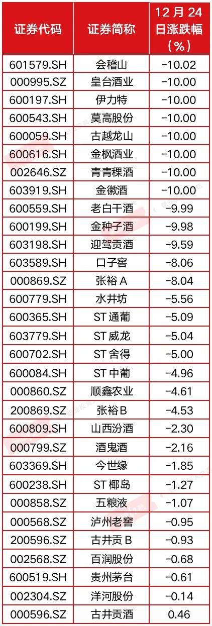 附表 12月24日白酒行业股价涨跌幅一览