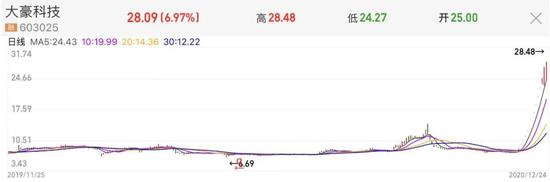 《红周刊》记者发现,在11月23日,大豪科技的成交额有1.03亿元,较前一个交易日成交额高出了7000多万元,若这些提前买入的资金并没有撤离,粗略估算的话,截至12月24日,已净赚约2.6亿元(11月22日收盘7.9元、12月24日收盘28.09元)。