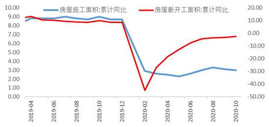 10月份房地产市场开始发力,竣工面积的修复加快,新开工面积回升放缓迹象。2020年10月房屋竣工面积累计值为4.92亿平方米,累计同比下降9.2%,降幅收窄2.4个百分点,竣工的修复在四季度仍有空间,但存不确定性。