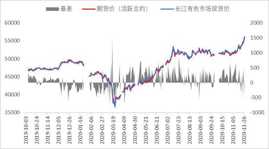 11月受宏观经济数据转好、疫苗取得进展以及铜精矿供应偏紧影响,铜价大幅上涨。截至10月27日,CU2101合约收于56120元/吨,较上月末上涨7450元/吨,涨幅15.31%;现货市场畏高情绪明显,现货成交相对较为平淡,贴水有扩大趋势,长江有色市场现货价为55630元/吨,较上月末上涨4040元/吨,涨幅7.83%。伦铜收于7476.5美元/吨,涨幅11.49%。