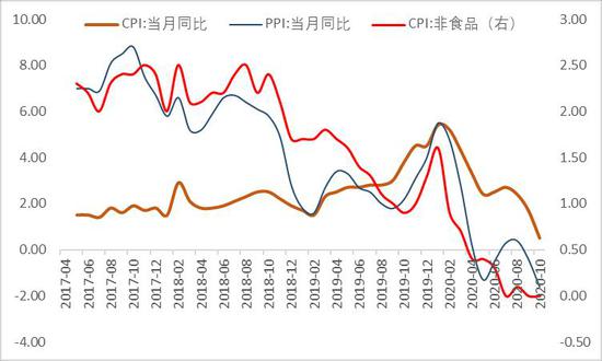 CPI持续下行,核心CPI维持低位。猪肉价格缓慢回落,基数效应也将对CPI产生一段时间的负向拉动。预计11月CPI同比可能回落至0左右。10月PPI降幅稳定在-2.1%,但国际原油价格环比回正,矿产、有色金属、钢铁类商品价格同比涨幅明显,PPI或有回升。