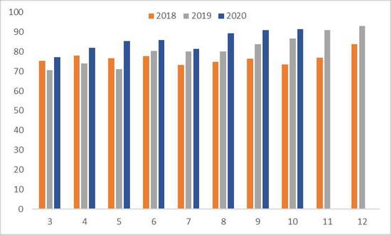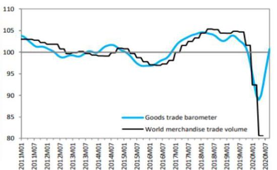 世界贸易组织报告显示,受出口订单快速增长拉动,今年第三季度全球货物贸易强劲反弹。具体来看,9月全球货物贸易景气指数达100.7,相较于8月发布的84.5有大幅提升。考虑到疫苗研制不断传来利好消息,全球贸易有望得到改善;拜登当选也增加了市场期望,预计全球货物贸易的反弹态势还能得到一定的延续。
