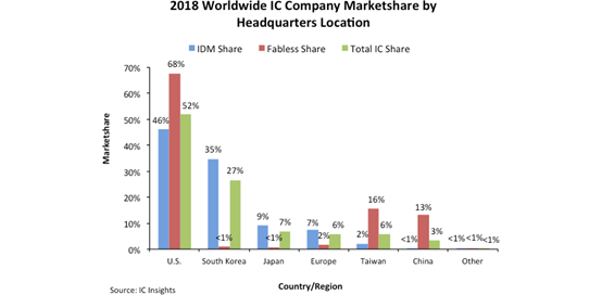 还是只做设计的Fabless芯片公司,还是两者综合,美国都是遥遥领先,都占了全球50%以上的份额。