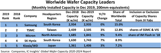 用下图会比较清楚,下图是2019年12月全球半导体制造厂的晶圆产能排名,包括了IDM厂和纯代工厂,是按照8寸晶圆折算。