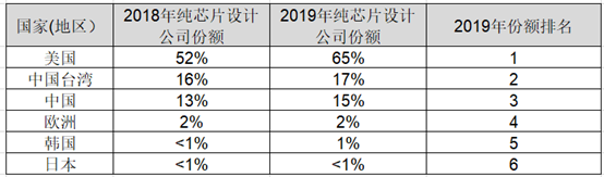 中国台湾的fabless公司全球份额2019年为17%,排名全球第二,